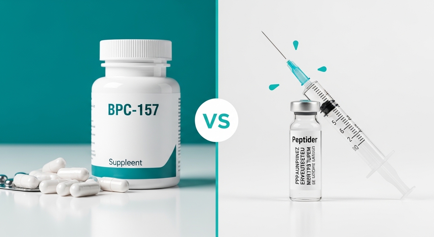Side-by-side comparison of oral BPC-157 capsules and injectable BPC-157 vial with syringe